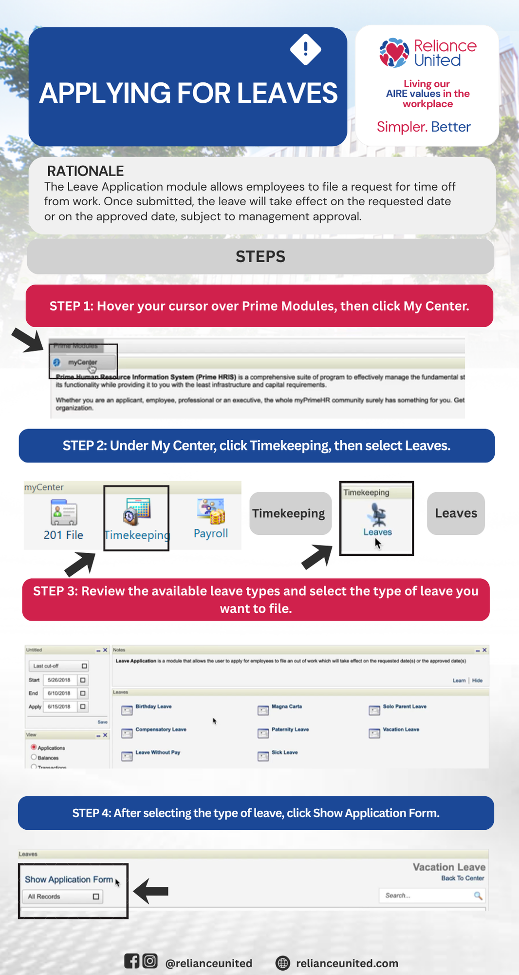 The Leave Application module allows employees to file a request for time off from work. Once submitted, the leave will take effect on the requested date or on the approved date, subject to management approval.